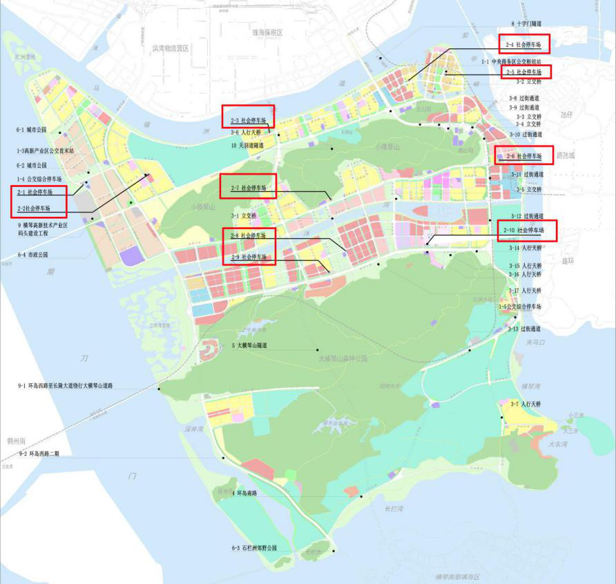 橫琴新區2018年社會停車場建設目前規劃的10個停車場,分別位于橫琴規劃結構的“三片,十區”。本項目包含9個停車場工程的建設,項目總用地面積約40700㎡,建設內容主要包括9個地塊的地下停車場及其配套設備用房、停車場地面廣場與綠化等。9個停車場位置情況如下: