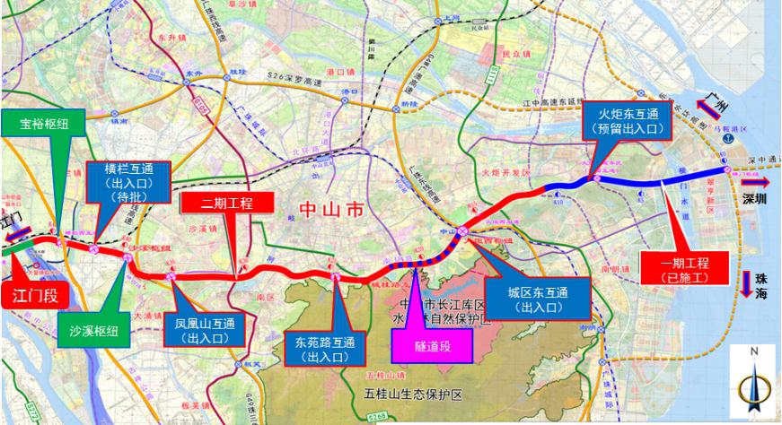項目在中山段共擬設置8座互通立交,由東向西依次為橫門樞紐、火炬東互通(預留出入口),城區東互通(出入口)、東苑路互通(出入口)、鳳凰山互通(出入口)、沙溪樞紐、橫欄互通(出入口)(待批)、寶裕樞紐(詳見下圖1)。