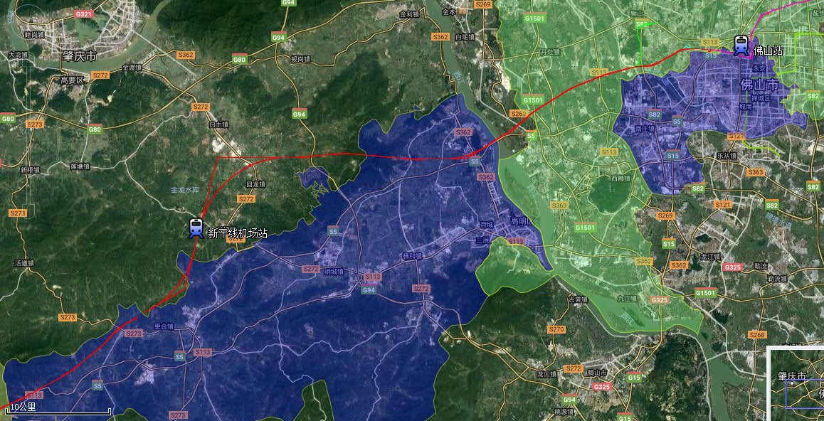 本項目線路離開廣州市,進入佛山市南海區,利用既有線增建二線,與本版總規設置的廣茂鐵路通道基本吻合。進入禪城區于現有佛山站西側設佛山站(改造既有佛山站作為高鐵客站)。出站后新建雙線向西行進入南海區,上跨穿過羅村、佛一環高速和東平水道,繼續西行分別經過三水區南側和高明區北側,出高明區進入肇慶市高要區,于高要設新干線機場站(地下)。后西行進入高明區,以隧道下穿合水鹿田森林公園,出高明區后進入云浮市新興縣。具體線路走向如附圖1所示。