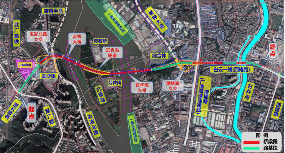 4.建設規模:路線全長約 3.89km,紅線寬度 42-61m,采用Ⅱ級公路兼城市主干路標準,設計速度 60km/h,雙向 8 車道。全線設置 2 座跨越珠江特大橋(沉香大橋、西華海大橋),2 處立交(彩濱北路立交、增槎路立交),2 座匝道(沉香島匝道)。