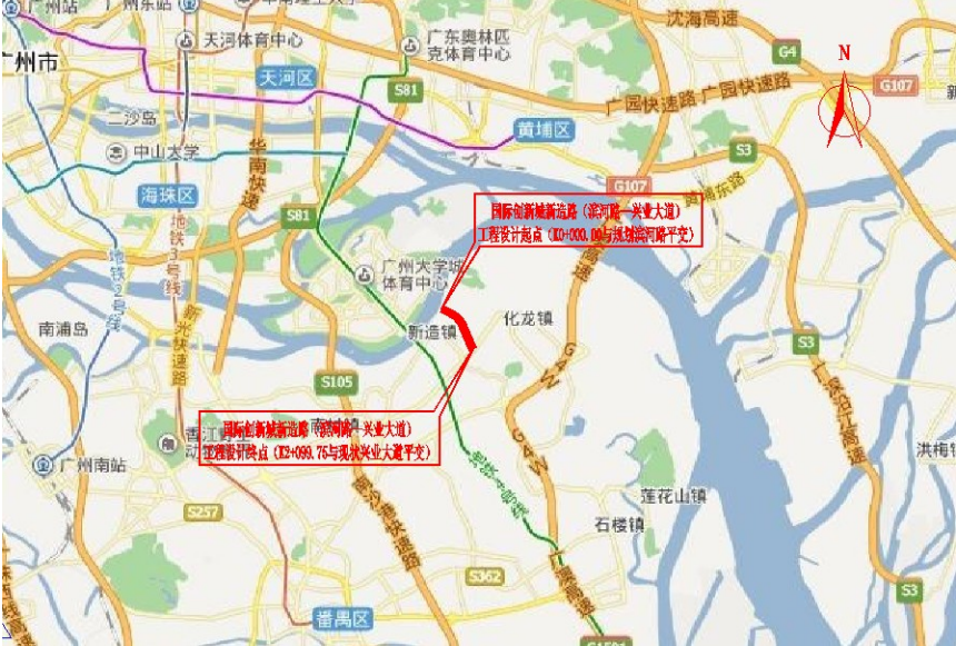 國際創新城新造路(濱河路—興業大道)工程位于番禺區新造鎮大學城南岸國際創新城啟動區,北起濱河路,南至興業大道,路線基本呈南北走向,道路設計全長約 2.1km,道路規劃為城市次干路,規劃紅線標準段寬度為 40m,部分展寬段寬度分別為 45m、50m。項目建設內容包括道路、涵洞、照明、交通、市政管網及景觀綠化工程等。根據道路建設需要,征收土地面積99067.05平方米。