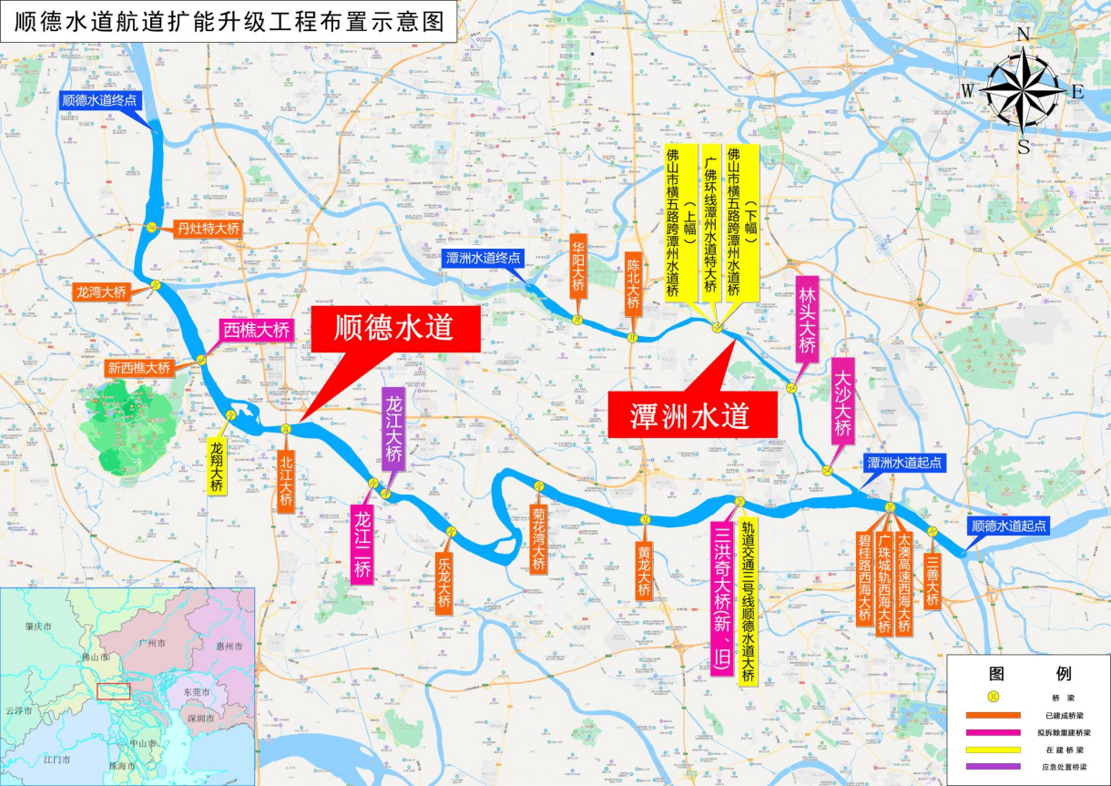 3、項目基本情況:本工程順德水道擴能升級工程整治河段從火燒頭至紫洞口全長50km,按內河Ⅱ級航道、通航 2000 噸級船舶要求進行建設。主要建設內容包括水道疏浚淺段0.30km;清礁工程2處;護岸工程3.2km;三洪奇大橋、龍江大橋(與龍江二橋合并建設)、龍江二橋以及西樵大橋(舊橋)拆除重建,其余未改建橋梁方案中均采用相應防撞設施進行防護;建設航標及標志標牌工程及其他工程。