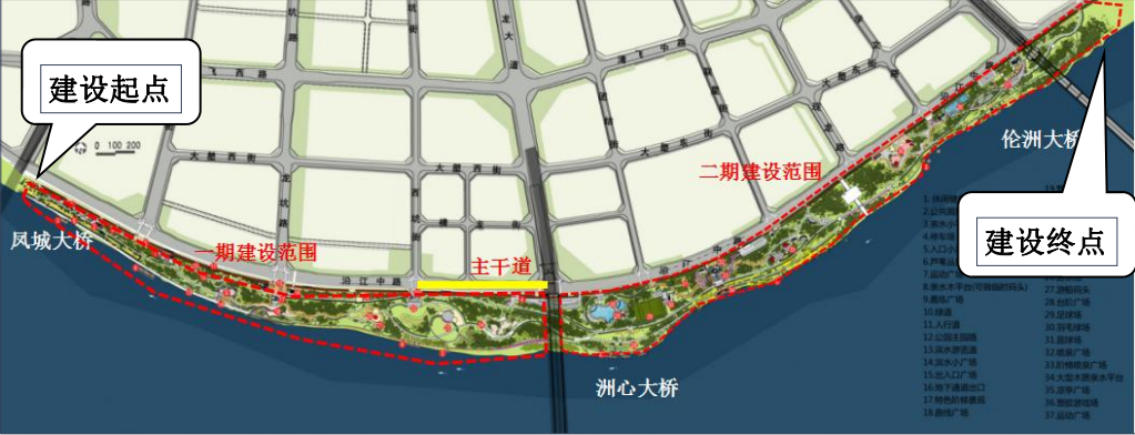 本項目建設用地總面積為497615㎡,主要建設內容包括:土方工程、園路與地面硬化工程、植被小品工程、綠化工程、配套用房建筑工程、室外體育活動場地工程以及配套設施工程等,分兩期建設。一期由鳳城大橋至洲心大橋,二期由洲心大橋至倫洲大橋。配套市政道路主線路全長約520m,道路紅線寬33.5m,建設內容包括道路工程、交通工程、排水工程、照明工程、綠化工程及其他零星工程,于一期工程中實施。
