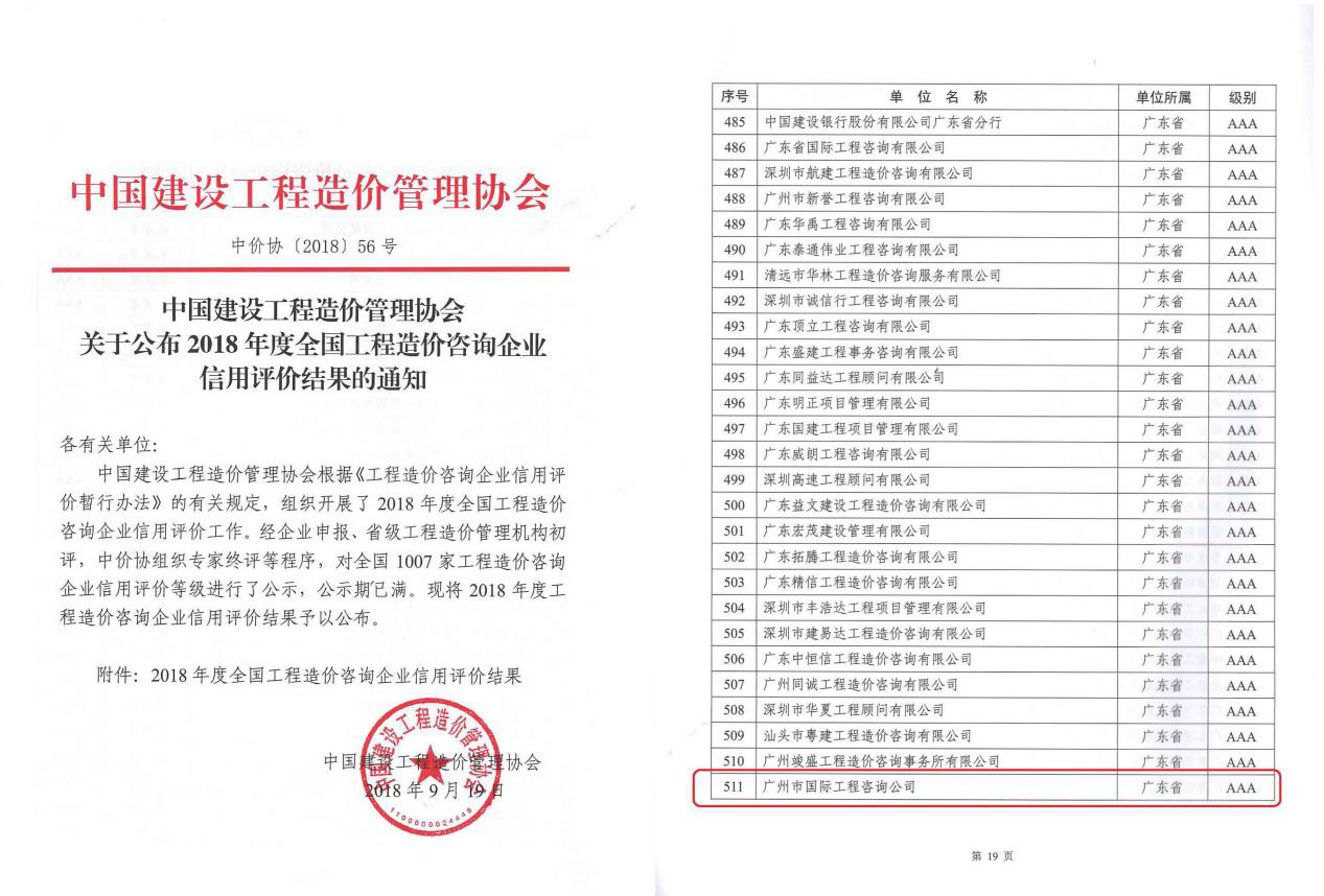 根據《工程企業信用評價暫行辦法》、《中國建設工程造價管理協會關于開展2018年工程造價咨詢企業信用評價工作的通知》(中價協〔2018〕2號)、《廣東省工程造價協會關于開展2018年工程造價咨詢企業信用評價工作的通知》(粵價協〔2018〕1號)等文件要求,我司在今年3月開啟了2018年工程造價咨詢企業信用評價的申報工作。在公司多個部門一個多月的通力協作下,繼獲得廣東省造價管理協會優秀的初評成績后,經過中國建設工程造價管理協會的審查評定,我司最終獲得了工程造價咨詢企業信用評價AAA級(最高等級),這是自2015年中國建設工程造價管理協會首次開展工程造價咨詢企業信用評價工作以來,我司連續兩次獲評工程造價咨詢企業信用評價AAA級。