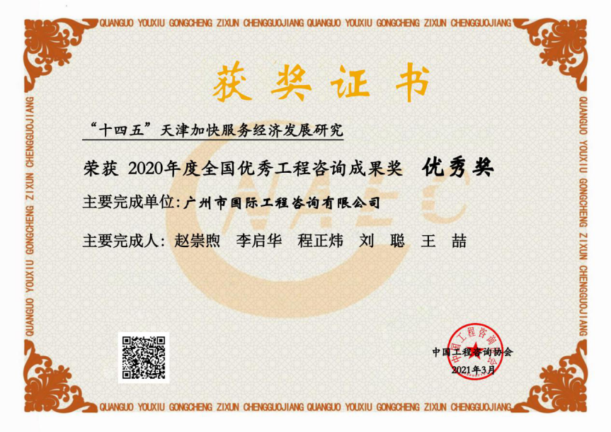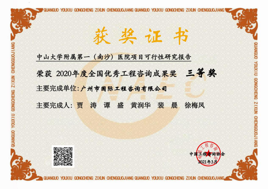 近日,中國工程咨詢協會公布了2020年度全國優秀工程咨詢成果獎評選結果,經過單位申報、初審單位初評、中國工程咨詢協會組織專家終審和社會公示等程序,廣州市國際工程咨詢有限公司編制完成的《廣州市本級政府投資項目建設用地費課題研究報告》《中山大學附屬第一(南沙)醫院項目可行性研究報告》和《“十四五”天津加快服務經濟發展研究》三個項目,分別榮獲2020年度全國優秀工程咨詢成果獎二等獎、三等獎和優秀獎。
