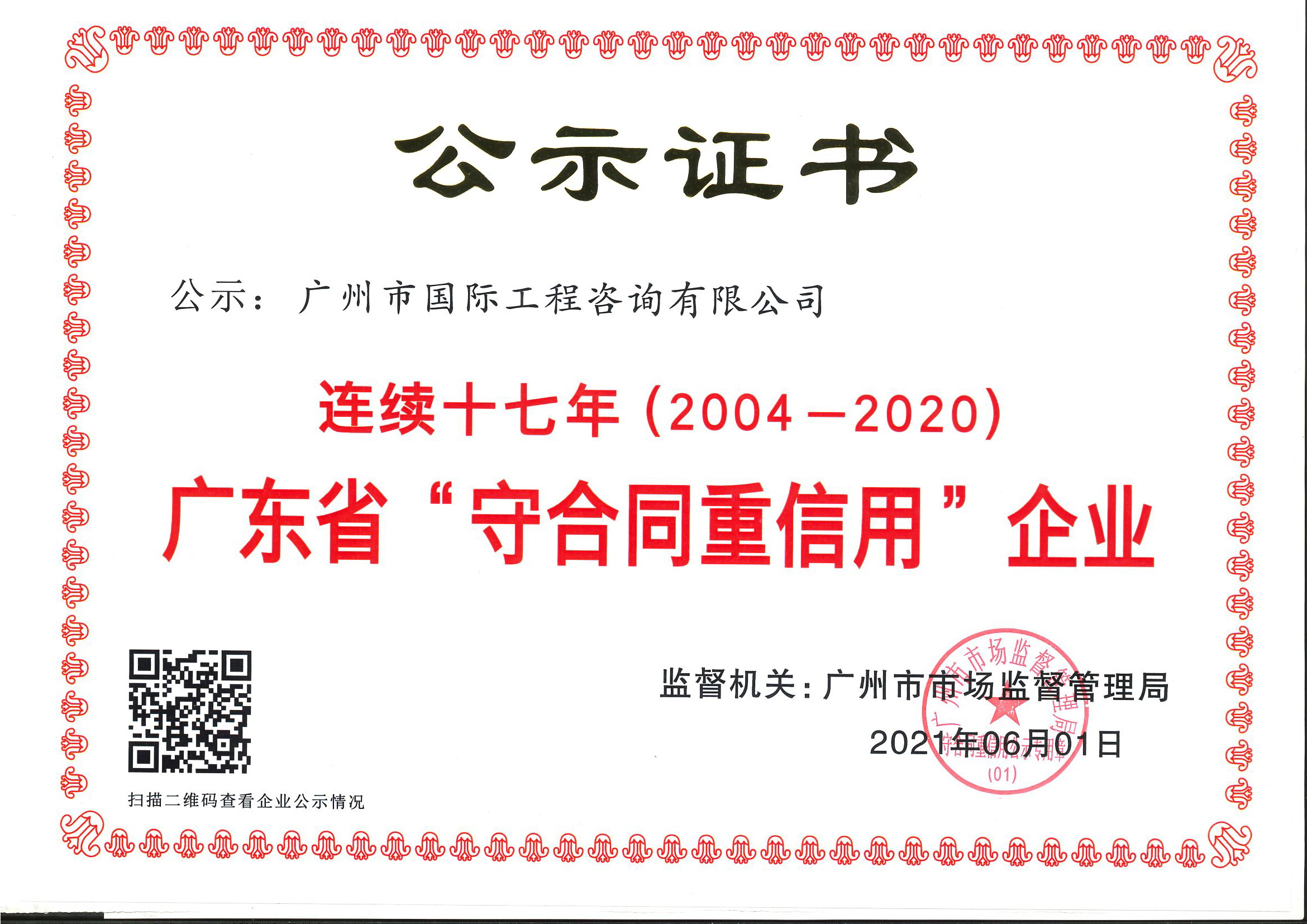近日,廣州市國際工程咨詢有限公司順利通過廣東省市場監督管理局與廣州市市場監督管理局評審,榮獲“廣東省守合同重信用企業”稱號,這是自2004年以來,我司連續十七年獲頒此殊榮,這也是我司多年守法經營,深入推動誠信建設、堅持誠信履約所取得的重要成果。