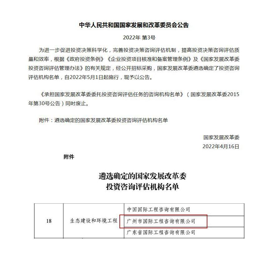 2022年4月28日,國(guó)家發(fā)展委公布了《遴選確定的國(guó)家發(fā)展改革委投資咨詢?cè)u(píng)估機(jī)構(gòu)名單》(中華人民共和國(guó)國(guó)家發(fā)展和改革委員會(huì)公告2022年第3號(hào)),廣州市國(guó)際工程咨詢有限公司(以下簡(jiǎn)稱“廣州國(guó)際咨詢公司”)成功入選“生態(tài)建設(shè)和環(huán)境工程專業(yè)”3家投資咨詢?cè)u(píng)估機(jī)構(gòu)之一。本次遴選共涉及19個(gè)專業(yè),全國(guó)范圍內(nèi)共有37家咨詢機(jī)構(gòu)入選。廣州國(guó)際咨詢公司是入選單位中少數(shù)幾家地方性咨詢機(jī)構(gòu)之一。